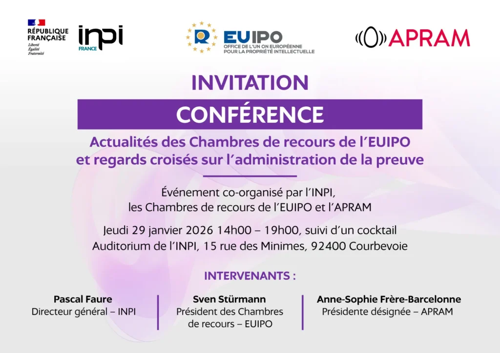 Chers Membres, Chers Amis, C’est un véritable honneur pour moi de prendre la plume pour ma première Nousletter en tant que Présidente de notre belle association, pratiquement deux mois après le début de mon mandat. Ces premières semaines ont déjà été riches en échanges et en évènements, dans la continuité de la dynamique impulsée par Julien Delucenay qui avait initié plusieurs projets significatifs pour l’APRAM en 2026. La conférence très réussie que nous avons coorganisée avec l’INPI et les Chambres de recours de l’EUIPO le 29 janvier en est un excellent exemple ! Ce début d’année s’inscrit résolument sous le signe de la collaboration et je m’en réjouis. Après l’INPI et l’EUIPO, nous avons eu le plaisir de coopérer à nouveau avec notre association sœur du Bénélux – BMM – lors de la troisième édition de notre conférence-afterwork qui s’est déroulée à Bruxelles, le 12 février. Nous avons ensuite rejoint nos six associations sœurs européennes pour une réunion annuelle de coordination début mars à Munich, à l’invitation de la GRUR et de l’ECTA. Je n’oublie pas non plus les liens forts qui unissent l’APRAM aux Universités, avec notre conférence annuelle du 13 mars, au cours de laquelle sera remis le Prix APRAM, et qui sera l’occasion de vous retrouver nombreux. Je vous invite d’ores et déjà à noter les dates de nos prochaines conférences dans vos agendas :
